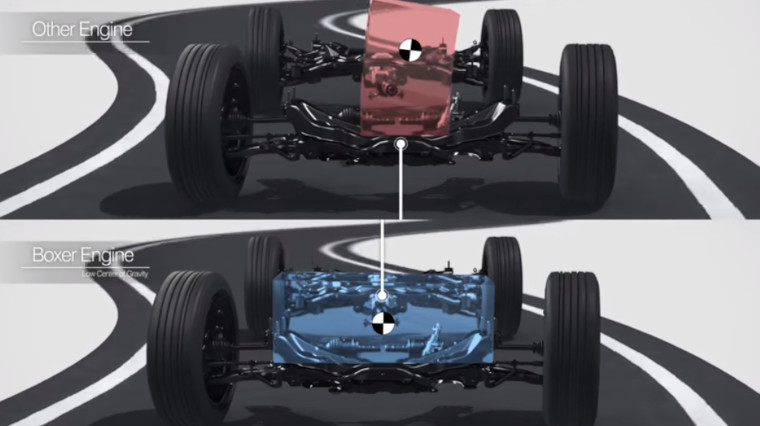 Mesin dapat dipasang lebih rendah di dalam kendaraan daripada mesin lainnya, dan keseimbangan bobot di kiri dan kanan dapat dibuat hampir sama persis. Dalam desain ini, pusat gravitasi mesin yang rendah menurunkan pusat gravitasi seluruh mobil. Demikian pula, mesin yang seimbang secara simetris meningkatkan keseimbangan simetris seluruh mobil. Kedua aspek ini digabungkan untuk menghadirkan pengalaman berkendara yang lebih aman, lebih stabil, dan pada akhirnya lebih menyenangkan.