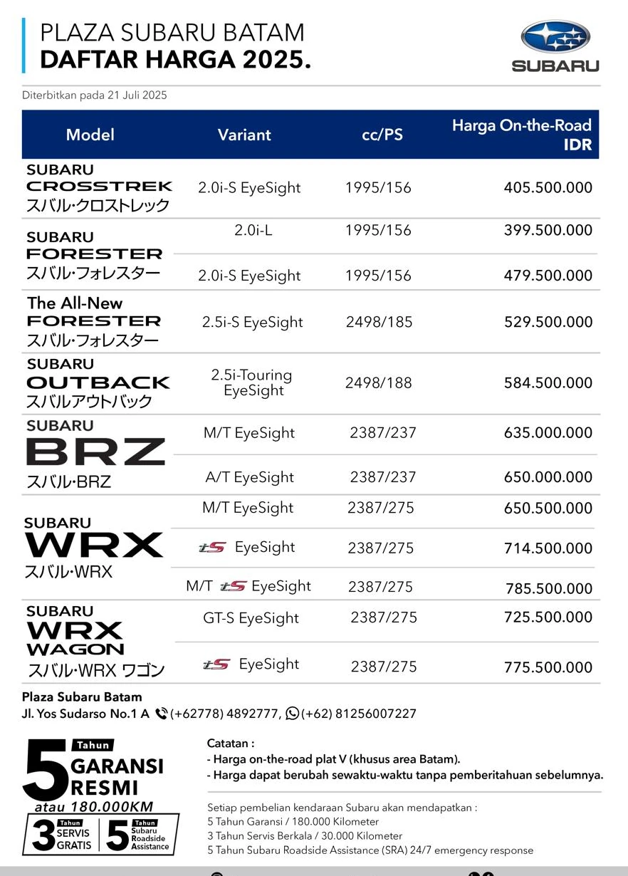 Segera Kunjungi Showroom Plaza Subaru Batam di Jl. Yos Sudarso Blok A No 1 Sungai Panas, Kota Batam Dapatkan Penawaran dan promo menarik lainnya. Stock…
