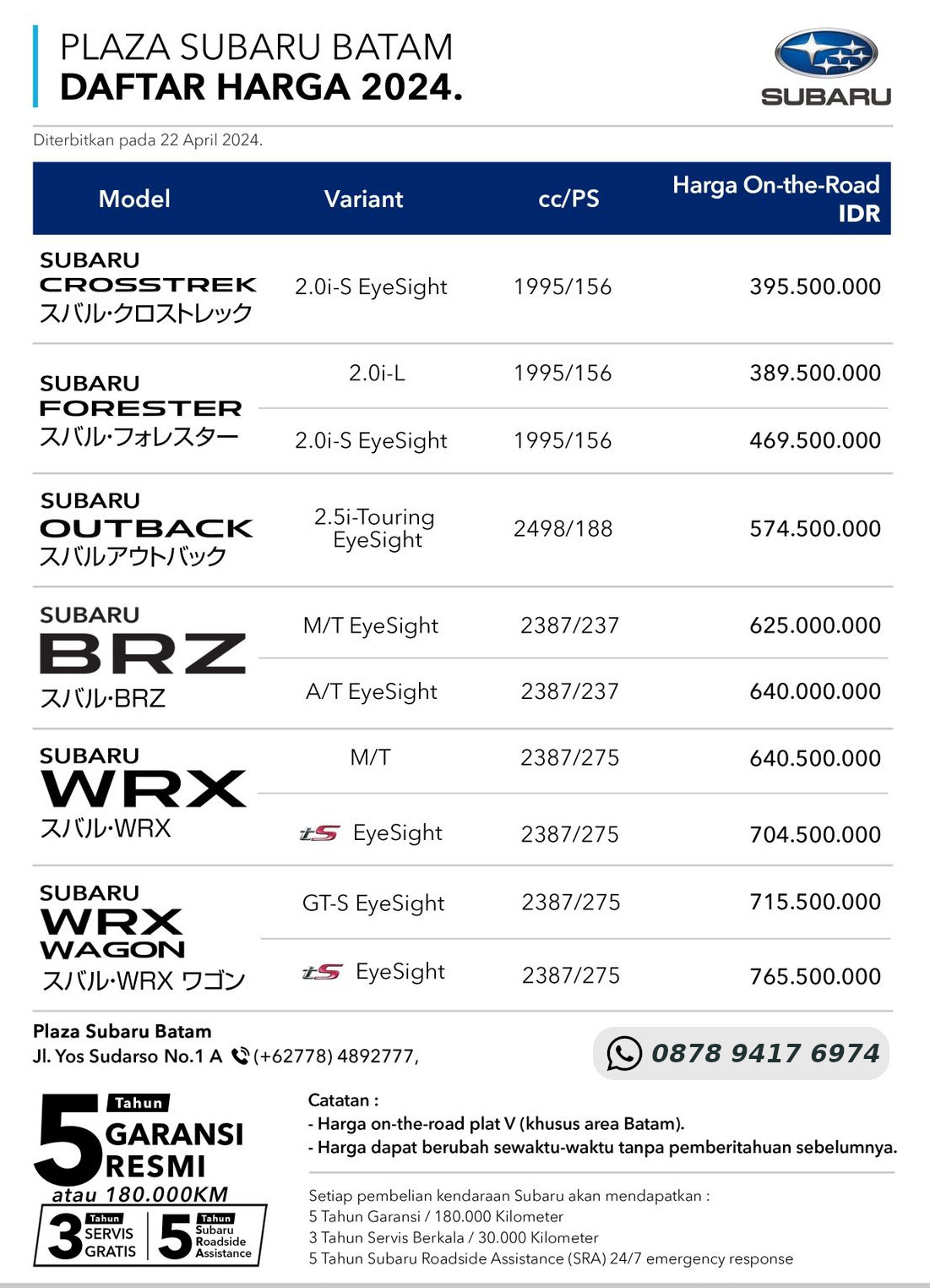 Pricelist Subaru 2024