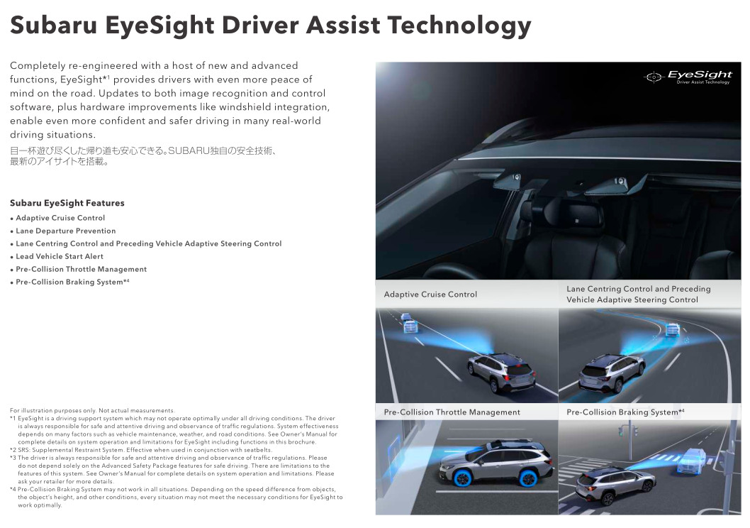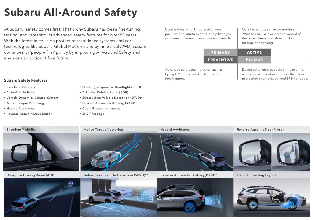 Keselamatan adalah yang utama bagi Subaru. Itulah mengapa Subaru telah menyempurnakan pengujian, dan menguji ulang fitur keselamatan canggihnya selama lebih dari 50 tahun. Dengan perlindungan tabrakan dan teknologi inti terbaru, Subaru melanjutkan kebijakan ‘mengutamakan manusia’ dengan meningkatkan Keselamatan Menyeluruh dan membayangkan masa depan bebas kecelakaan.